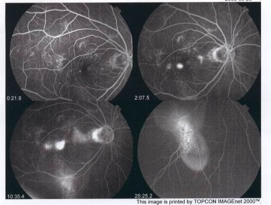 目前认为黄斑部病变是继发于这些渗漏造成的,象脉络膜的炎症。MRI和视野没相关的异常。