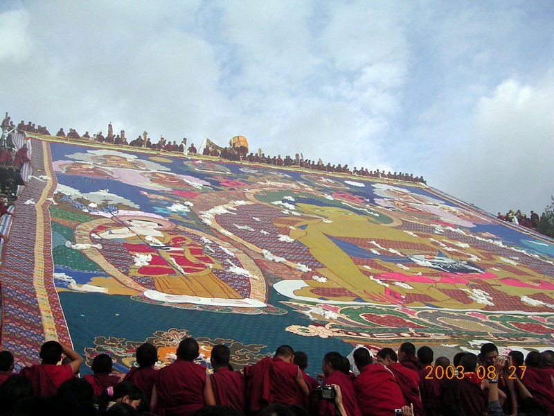 因为是西藏的传统节日,因此医院也放假四天,加上周末,一个六天。这对于我们来说,是在西藏观光了解西藏风土人情的重要的日子。清晨5点,妇产科同事的电话就叫起了我们。匆匆吃过方便面(因为没有筷子,我们只好用牙刷把#^@#^&)就出发了。虽然是清晨,但是大街上的人并不少,小巴士开了约20分钟,就到了哲蚌寺山下。我们一行7人(包括当地医院妇产科两名大夫旺母和李大夫,旺母的爱人和她的侄女)摸黑就开始上山。山道两旁到处是点燃的松香叶,整个山道弥漫着令人窒息的松叶的烟雾。经过40分钟的跋涉,我们终于来到了哲蚌寺进行"展佛"法事的佛台下面,这时候天色已亮,可以看见整个山坡上分布着密密麻麻的人,估计不少于10万人。展佛台宽约40米,高约60米,显得很是雄伟壮观。难怪他们说雪顿节是西藏最重要的节日。几乎所有的有条件来此的拉萨人都来了。远处的哲蚌寺传来西藏传统的长号声,从寺庙中走出一对僧人,前面的僧人举着巾幡,后面的僧人抬着一个长长的白色的圆柱状的物体(大佛像卷)。随着僧人们走进展佛台下面的人群,人群开始激动兴奋,各种颜色的法符满天飞舞,从人群中不断地飞出洁白的哈达落在旌幡上、佛像卷上。伴随着人群的兴奋,人潮开始波浪式的涌动,我身处人潮中不由自主的随波而动,但是我所在的位置是一个斜坡,我开始担心过多的人群拥挤可能酿成惨剧(这种报道平时也见过,只是从不希望自己碰上),但是人潮的涌动怎么可能是我个人能控制的,所以只是尽量使自己保持平衡。在我后面有一对老年夫妇,因为不嵌忍受人潮的拥挤而不住的央求旁边的人不要太挤。